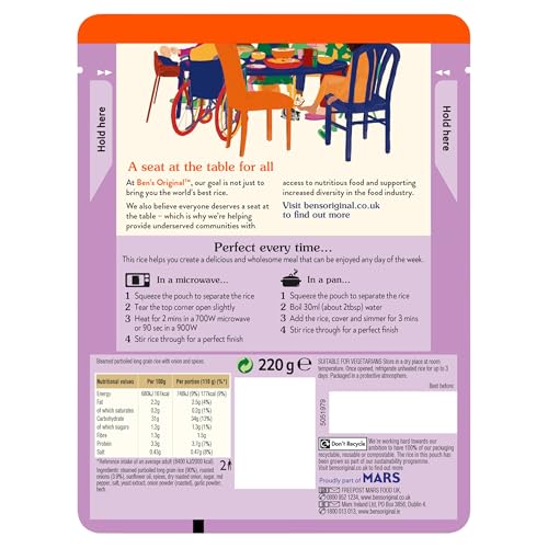 Ben's Original Onion Bhaji Microwave Rice combines perfectly steamed long grain rice with roasted onions and aromatic spices for a quick, flavorful meal. Ready in just 2 minutes, this microwaveable rice is ideal for busy days when you want the taste of a takeaway without the effort. Suitable for vegetarians and made with no artificial colours, flavours or preservatives, it's a convenient and wholesome choice.
