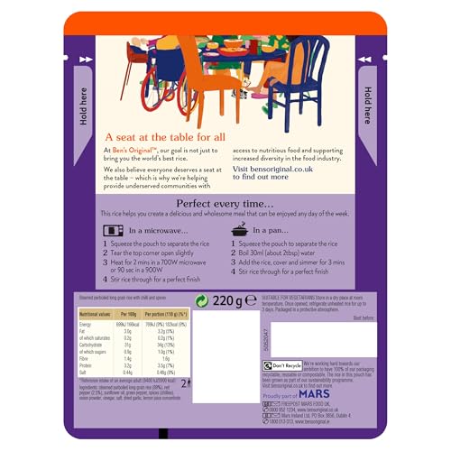 Ben's Original Peri Peri Microwave Rice combines perfectly steamed long grain rice with vibrant red pepper, green pepper, chilli, and a blend of spices for a bold, zesty flavour. Ready in just 2 minutes, this convenient microwaveable pouch makes it easy to enjoy a delicious, wholesome meal with minimal prep and cleanup. Ideal for busy weeknights or quick lunches, it's perfect served alongside grilled cod, chicken skewers, or your own creative recipes.