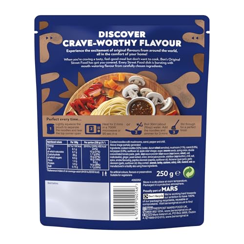 Enjoy the bold and satisfying flavors of Korean street food in just 90 seconds with Ben's Original Street Food Korean BBQ Style Noodles. This vegetarian ready meal combines perfectly cooked round noodles with mushrooms, carrots, red peppers, and a spicy-sweet smoky sauce for a delicious, convenient meal any time of day.