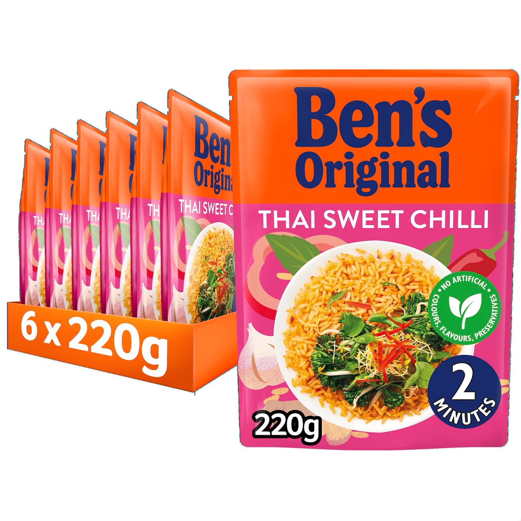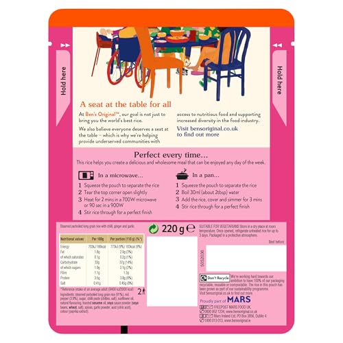 Ben's Original Thai Sweet Chilli Microwave Rice combines perfectly steamed long grain rice with vibrant red peppers, chillies, garlic, and ginger for a flavorful, ready-in-minutes meal. This convenient microwaveable pouch heats up in just 2 minutes, making it ideal for quick lunches, dinner sides, or creative rice-based dishes. Ideal for vegetarians, this rice is free from artificial colours, flavours, and preservatives, and is made from sustainably sourced ingredients.