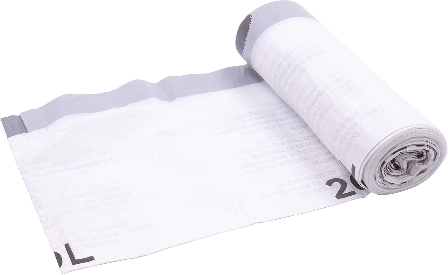 Packaged on an easy-to-use dispenser roll, the 20 bin liners can be removed one at a time without tearing or jamming, offering hassle-free access. Ideal for home or kitchen use, these white bin liners combine strength, convenience, and universal fit.