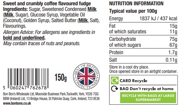 Founded in 2007 in Wetherby, Yorkshire, Bon Bon's is part of the Lanchester Wine Group and specializes in premium hand-packed sweets for the fine food market. This coffee-flavored fudge offers a luxurious twist on a classic British treat, perfect for gifting or personal indulgence.