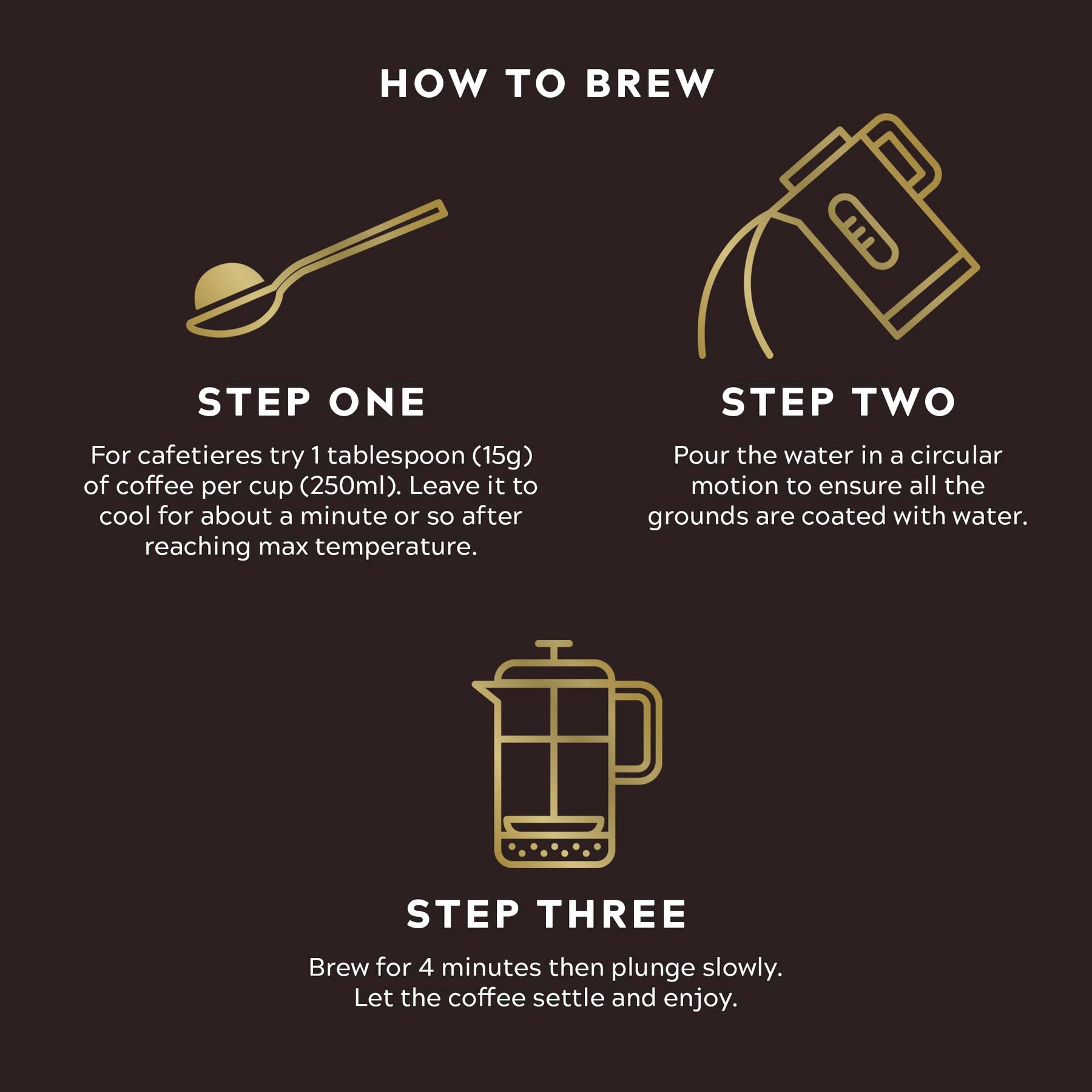 Grown by the farmers of the Cosurca co-operative in the South Cauca region of Colombia, where three mountain ranges meet to form the Andes, this medium-bodied coffee has a smooth and velvety flavour with a chocolate finish. Expertly ground for filter or cafetière use, it offers a strength 3 profile ideal for any time of day.