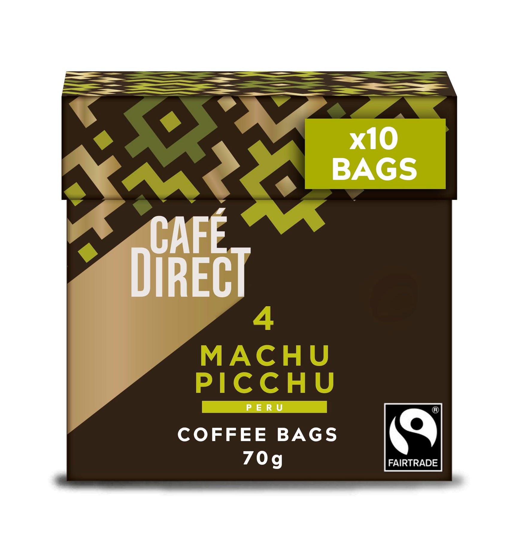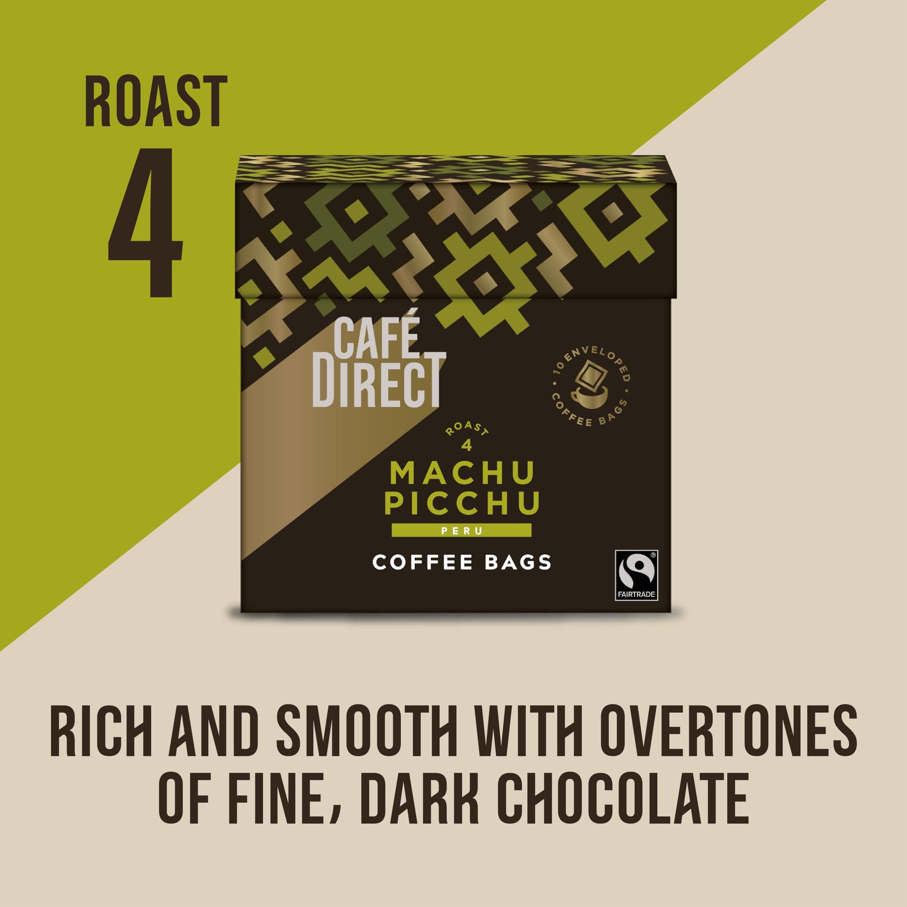 Experience the rich, full-bodied taste of Cafédirect's Machu Picchu Fairtrade Arabica Coffee, sourced from the Peruvian Andes. Individually wrapped coffee bags offer a convenient, single-serve solution perfect for home or on-the-go brewing. A step up from instant coffee, these specialty-grade bags deliver bold flavor with dark chocolate overtones, developed through a medium-dark roast that highlights the unique terroir of the legendary Inca heartland.