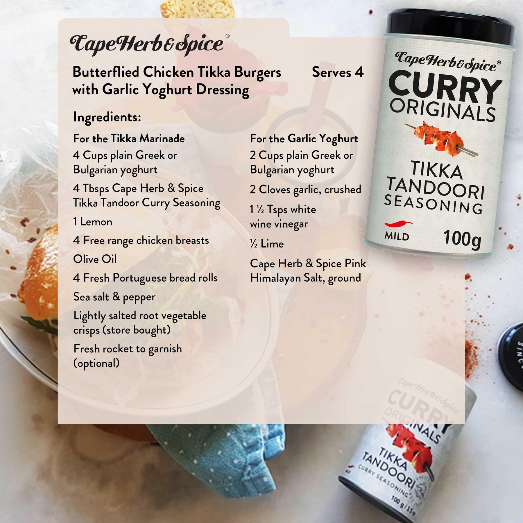 A deliciously authentic tikka curry spice based on the popular flavour profile using the tandoor method of cooking. Simply combine the blend of spices with yoghurt and marinade for at least 30 minutes. Skewer your meat and then either grill or oven bake, turning occasionally. Cape Herb and Spice, based in South Africa, captures a vibrant blend of cultures and flavours with their seasoning solutions - from the tip of Africa to the tip of the tongue.