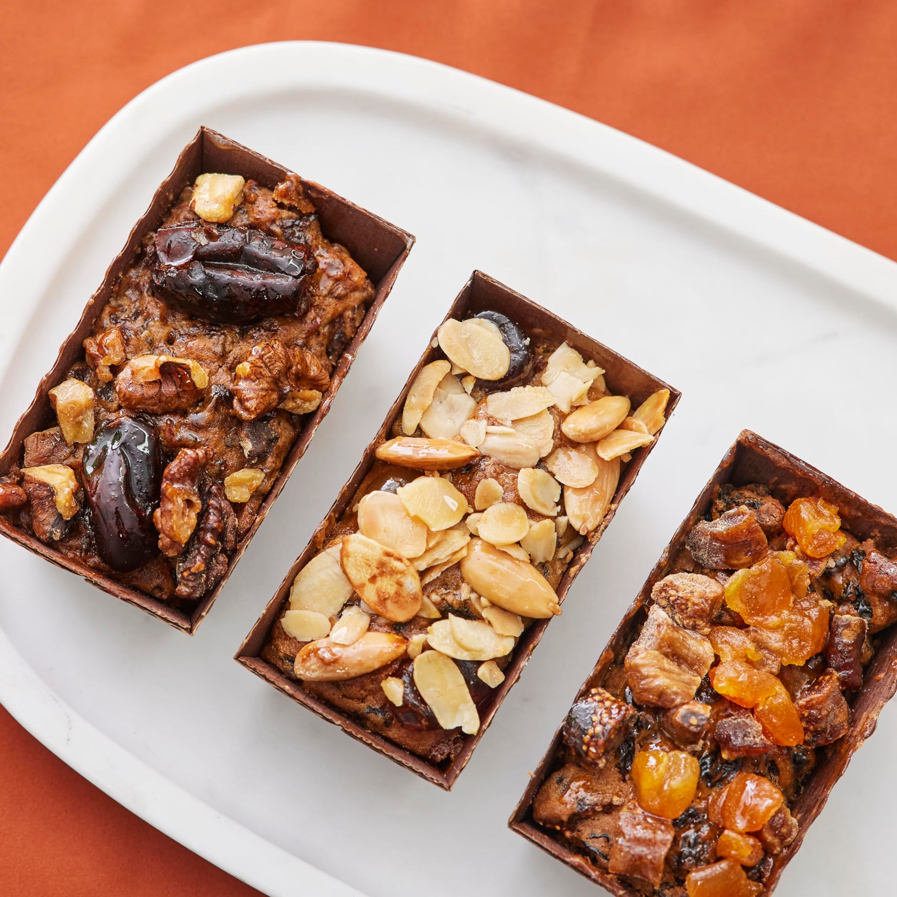 - Three signature mini loaf cakes: Cherry & Almond, Date & Walnut, and Fig & Apricot