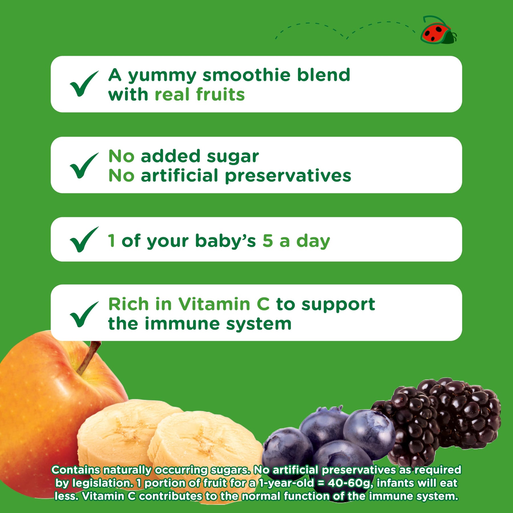 Cow & Gate Forest Fruit baby food pouch is a delicious and nutritious smoothie made with real fruits, perfect for your baby's weaning journey. Ideal for first tastes and textures, this smoothie contains apple (29%), banana (25%), Greek style yoghurt from milk (15%), blueberry (10%), blackberry (8%), strawberry (8%), purple carrot (4%), rice flour (3%), milk mineral powder, vitamin C, and lemon juice from concentrate.