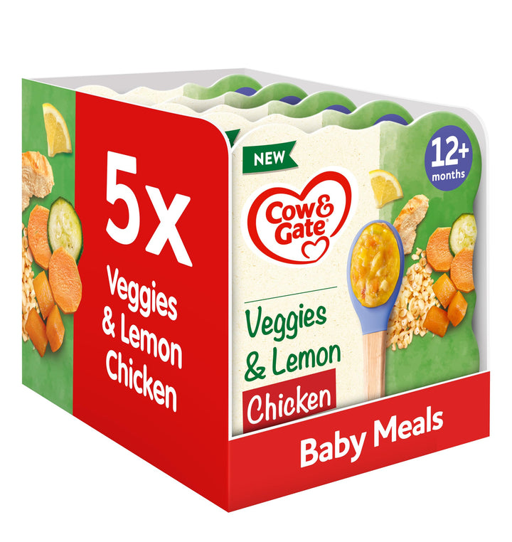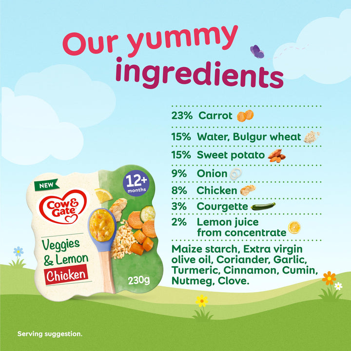 At Cow & Gate, we believe every spoonful is a milestone in your baby’s weaning journey. Our lemon, chicken & vegetables toddler meal is specially designed for babies 12 months and older, featuring varied texture pieces to help your little one explore new tastes and develop chewing skills. Made with real ingredients including carrot (23%), sweet potato (15%), and chicken (8%), this nutritious meal supports a balanced diet during weaning.