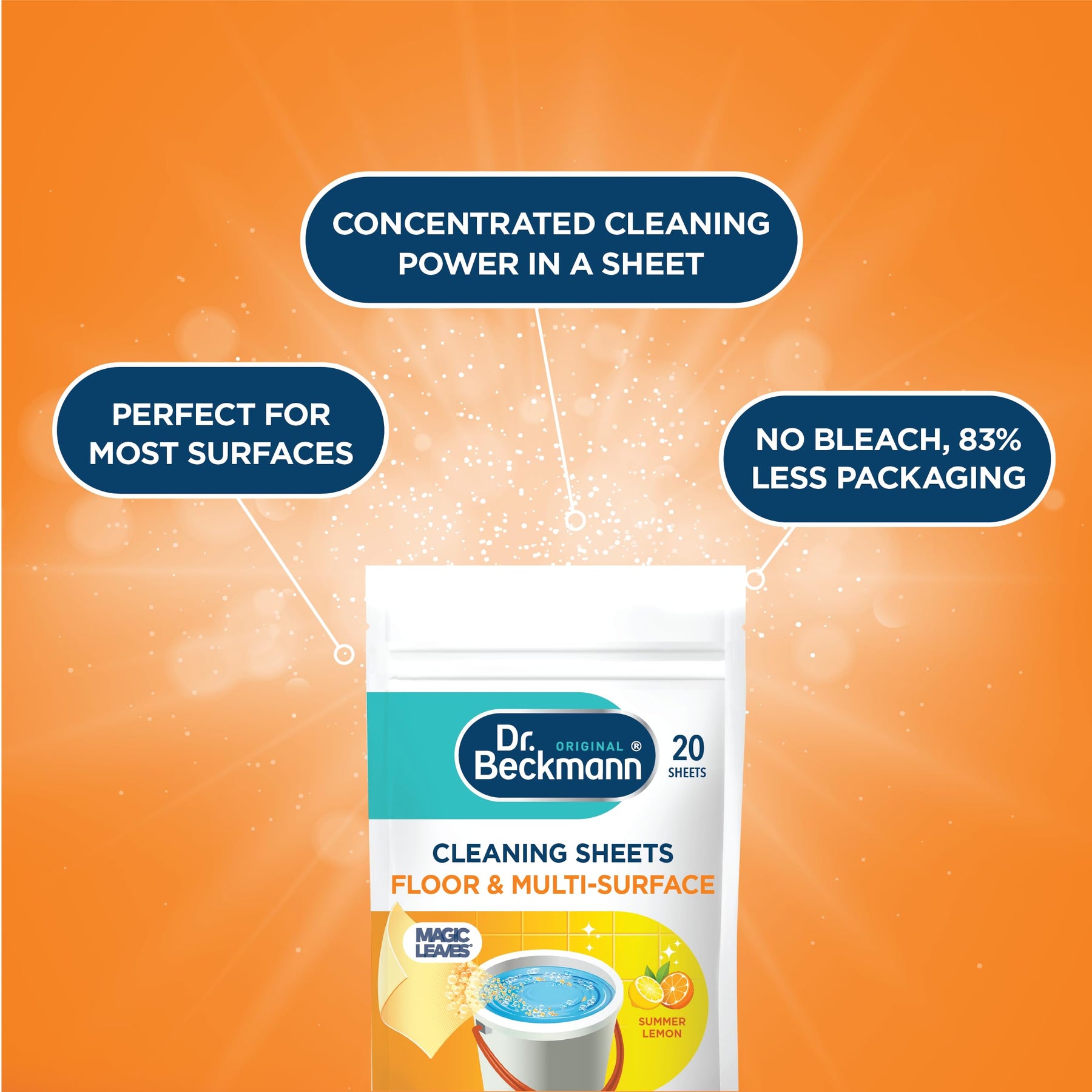 Dr. Beckmann all-purpose cleaning sheets revolutionize household cleaning with their innovative ultra-concentrated MAGIC LEAVES technology. These lightweight, fast-dissolving sheets create a powerful cleaning solution that tackles dirt and grease on a wide range of surfaces and floors, leaving behind a fresh summer lemon scent and a streak-free, hygienic finish.