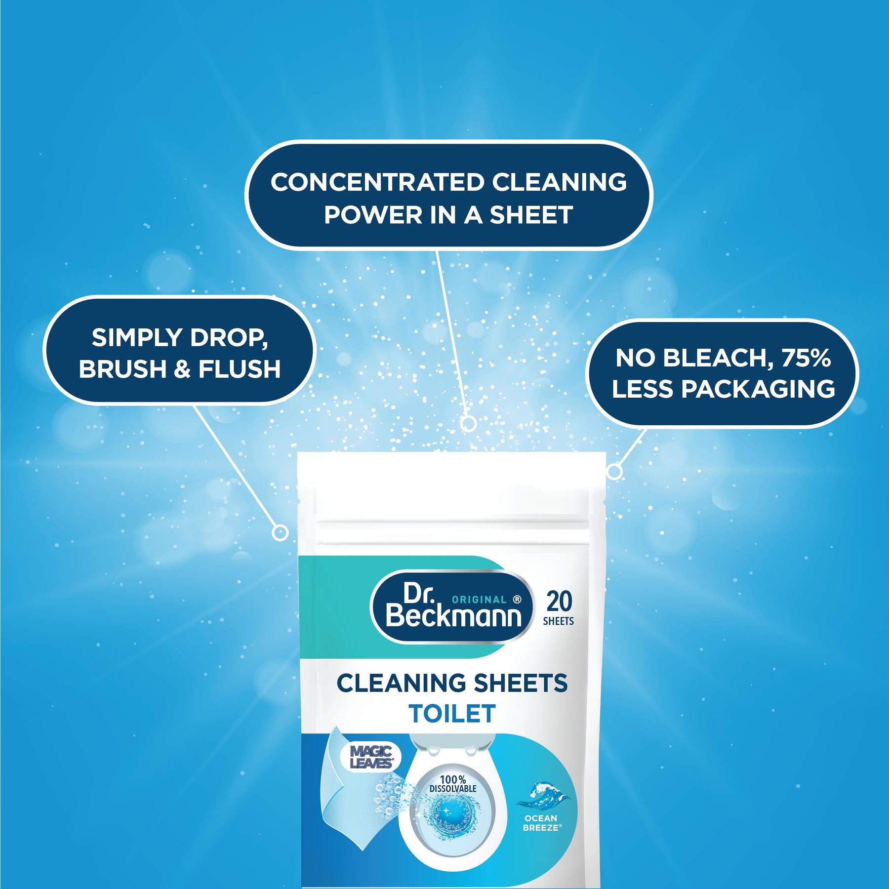 Dr. Beckmann Toilet Cleaning Sheets revolutionize your bathroom cleaning routine with ultra-concentrated MAGIC LEAVES sheet technology. These 100% dissolvable sheets deliver powerful cleaning performance against stubborn dirt, limescale, and urine stains, leaving your toilet brilliantly clean and hygienic. Simply drop a sheet into the toilet bowl, brush, and flush for a fresh ocean breeze scent and lasting freshness.