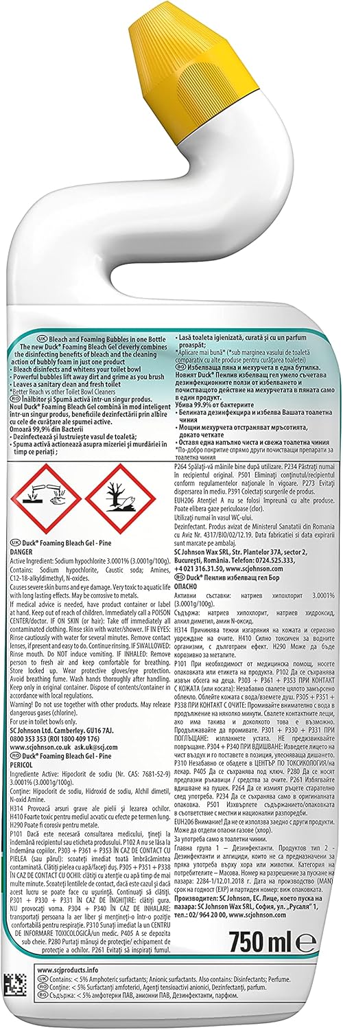 Duck Extra Power Foaming Bleach Gel effectively cleans and whitens toilet bowls by combining the stain-fighting power of bleach with the deep-cleaning action of foaming gel. Its thick formula clings to surfaces, reaching under the rim for a more thorough clean, leaving your bathroom fresh with a long-lasting Marine scent.