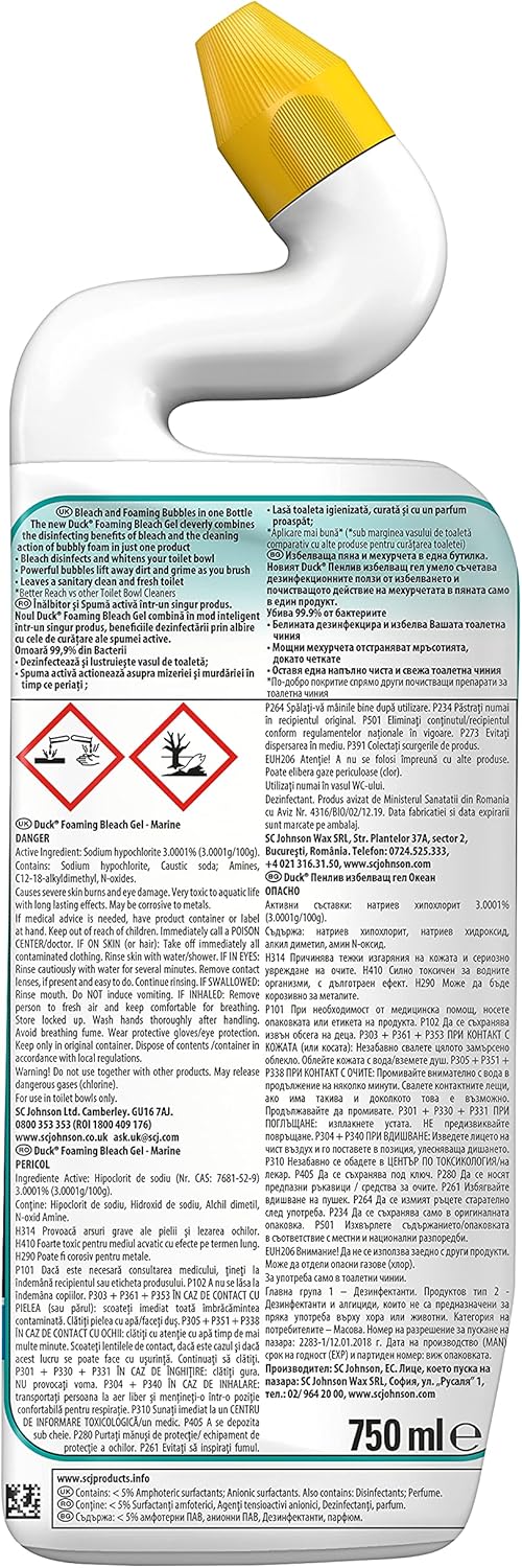 Duck Extra Power Foaming Bleach Gel effectively cleans and whitens toilet bowls by combining the stain-fighting power of bleach with the deep-cleaning action of bubbling foam. Its thick gel formula clings to surfaces, reaching under the rim for a more thorough clean, leaving your toilet sparkling and fresh with a long-lasting Marine scent.