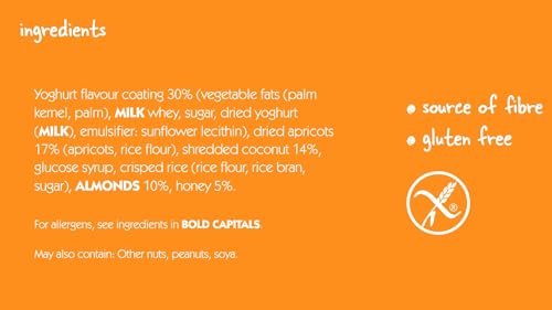 - Ingredients: Yoghurt Flavour Coating (30%), Dried Apricots (17%), Shredded Coconut (14%), Glucose Syrup, Crisped Rice, Almonds (10%), Honey (5%)