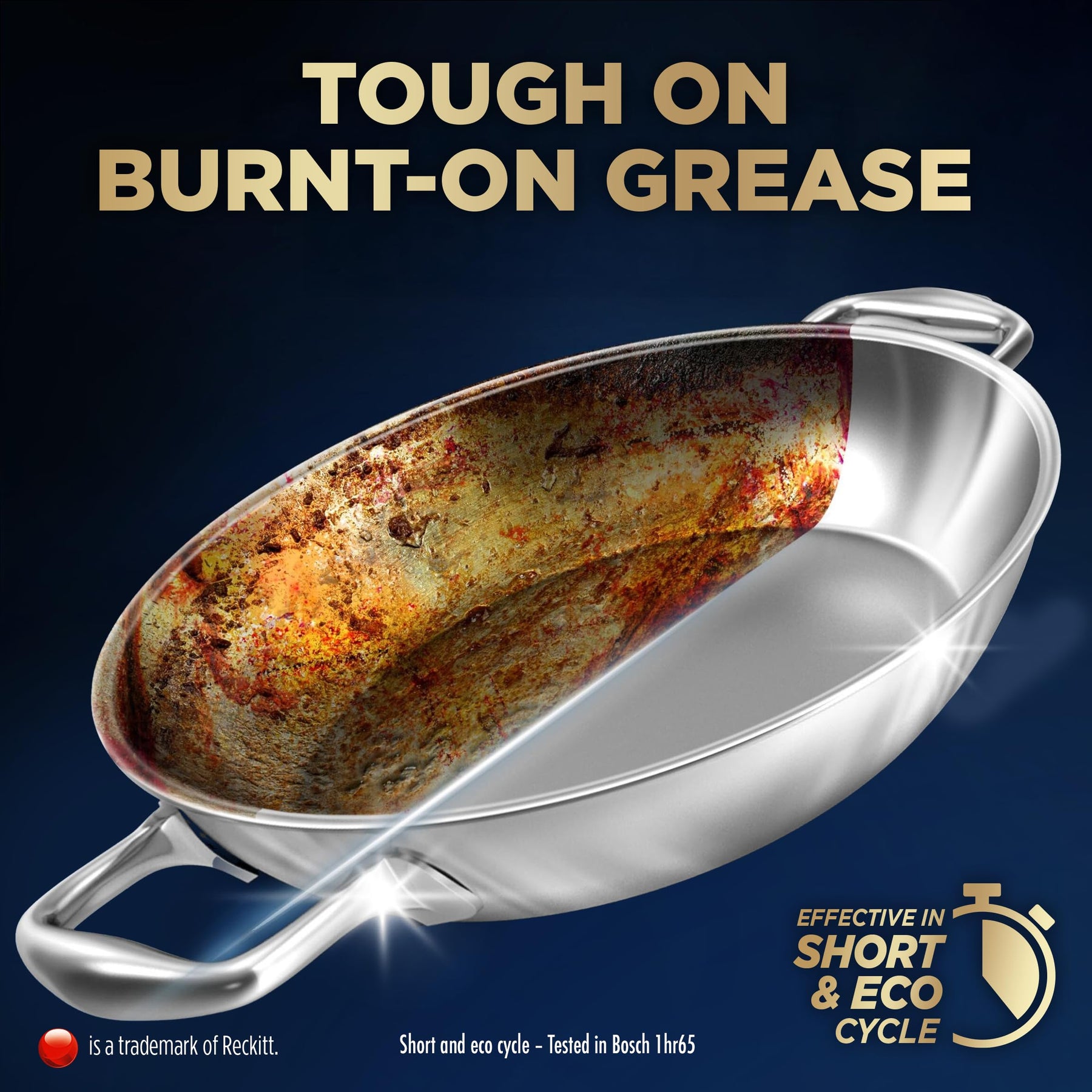 - Eliminates tough, dried-on food residues without pre-washing