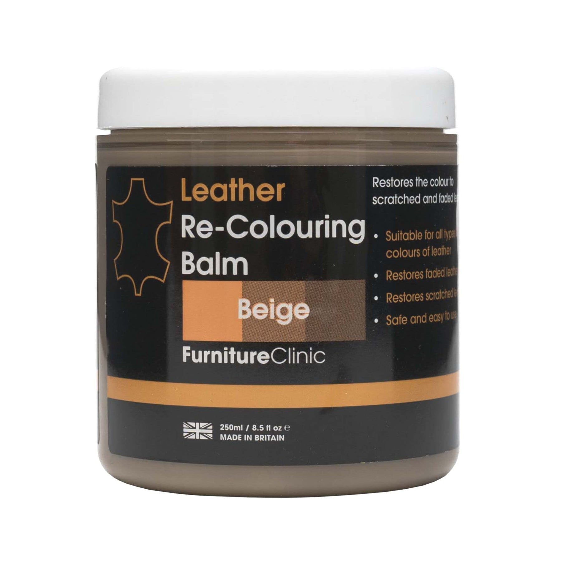 Available in 16 shades, including Beige. For non-absorbent leathers or deep damage, consider the Furniture Clinic Leather Repair Kit. Also available in a Complete Leather Restoration Kit for full care coverage.