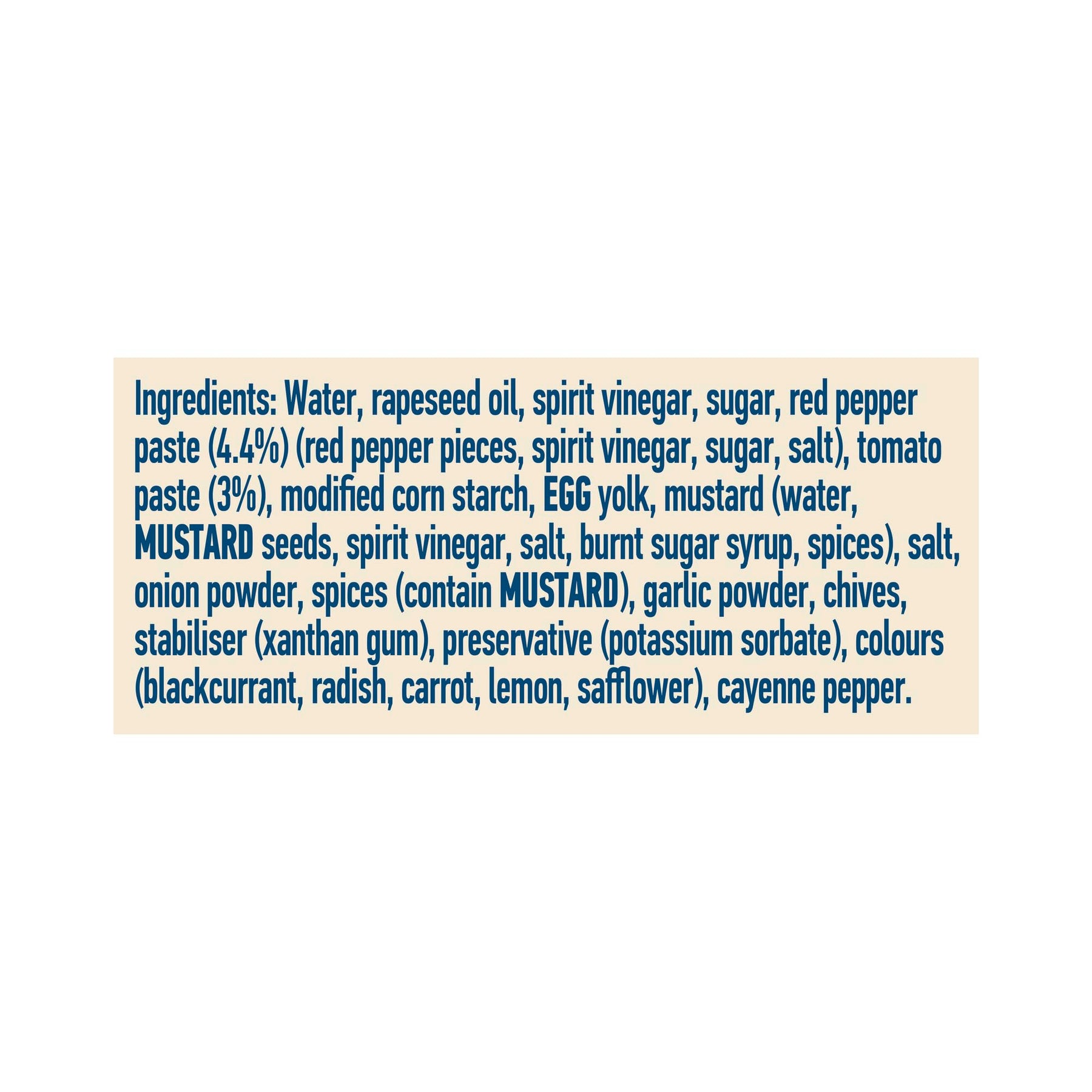 • Ingredients: Water, rapeseed oil, spirit vinegar, sugar, red pepper paste (4.4%), tomato paste (3%), egg yolk, mustard, salt, onion powder, spices (contain MUSTARD), garlic powder, chives, xanthan gum, potassium sorbate, natural colours (blackcurrant, radish, carrot, lemon, safflower), cayenne pepper