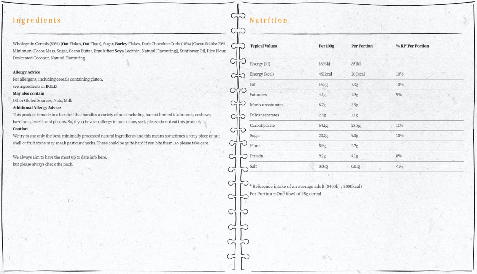 • Contains: Oats, barley, soya, hazelnuts, wheat, rye, other nuts, milk