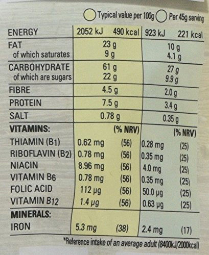 • Nutritional values based on 100g serving: Fat 24g (sat. 10g), Carbohydrate 64g (sugars 22g), Protein 7.6g, Salt 0.78g