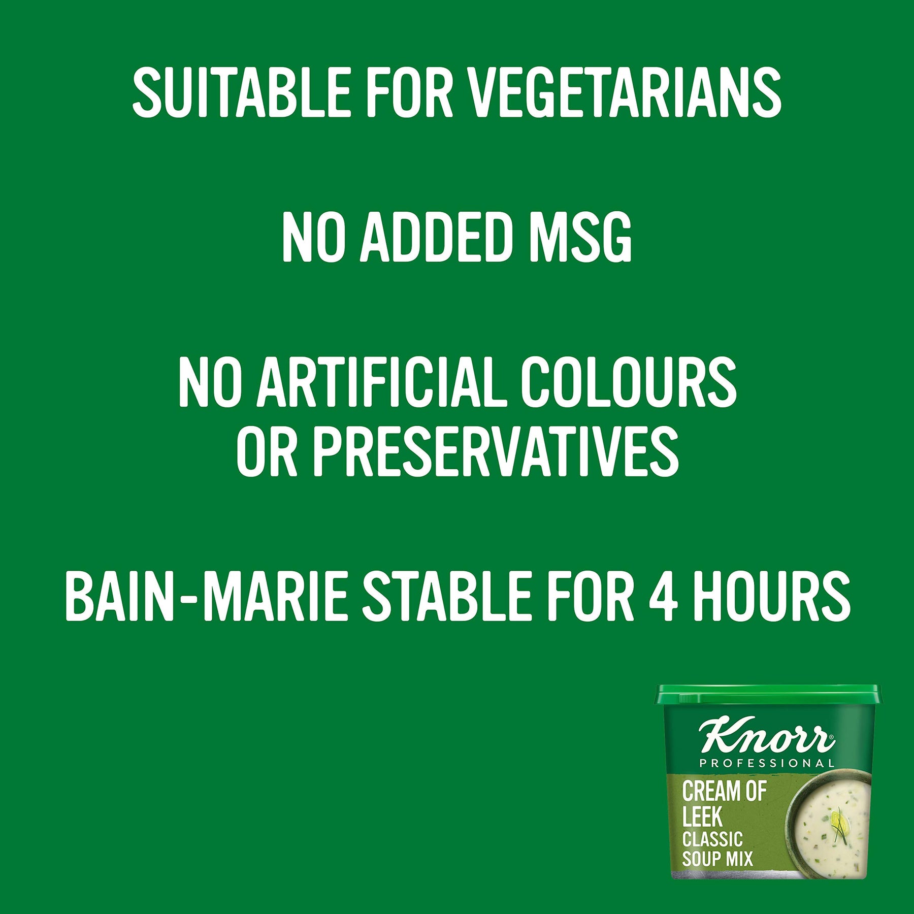 Knorr Classic Cream of Leek Soup is a convenient dehydrated soup mix that makes 25 portions of 175ml each. Simply whisk 75g of the mix into 850ml of boiling water, bring back to the boil while whisking occasionally, then cover and simmer for 3 minutes for a delicious, creamy soup. Ideal for professional kitchens, this vegetarian-friendly soup contains no added artificial colors or preservatives and is bain marie stable for easy serving. Made with sustainably grown leeks (6.1%), potatoes (3.3%), spring onions (2.7%), and enriched with spinach and turmeric for flavor and color.