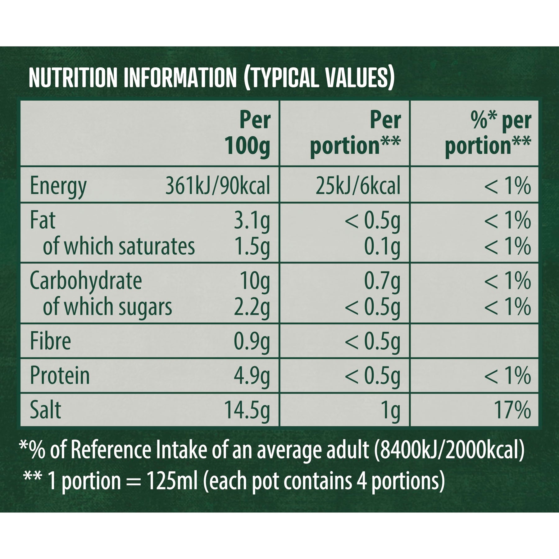 Concentrated Beef Stock (Water, Beef Extract) (41%), Glucose Syrup, Salt, BARLEY Malt Extract, Potassium Chloride, Beef Fat (2.5%), Caramel Syrup, Yeast Extract, Flavourings (contains MILK), Sugar, Maltodextrin, Palm Fat, Gelling Agents (Xanthan Gum, Locust Bean Gum), Onion Juice Concentrate, Sunflower Oil, Thyme, Lemon Juice Powder