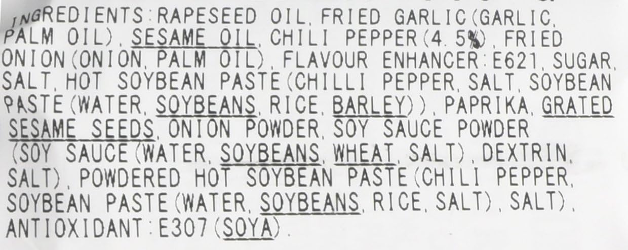 • Ingredients: Rapeseed Oil, Fried Garlic, Sesame Oil, Red Pepper, Fried Onion, MSG, Sugar, Salt, Soybean Chilli Paste (Red Pepper, Salt, Soy Bean, Rice, Barley), Paprika, Ground Sesame, Onion Powder, Soy Sauce Powder (Wheat), Soybean Chilli Paste Powder (Red Pepper, Soybean, Salt, Rice), Tocopherols (Vitamin E)