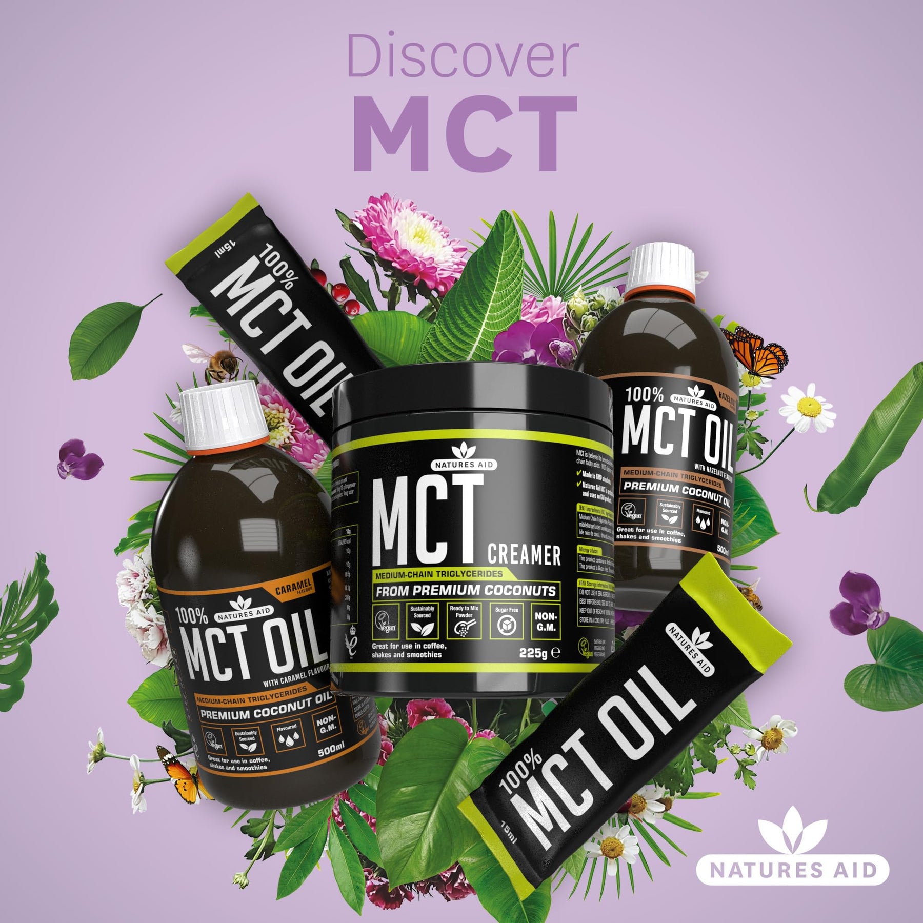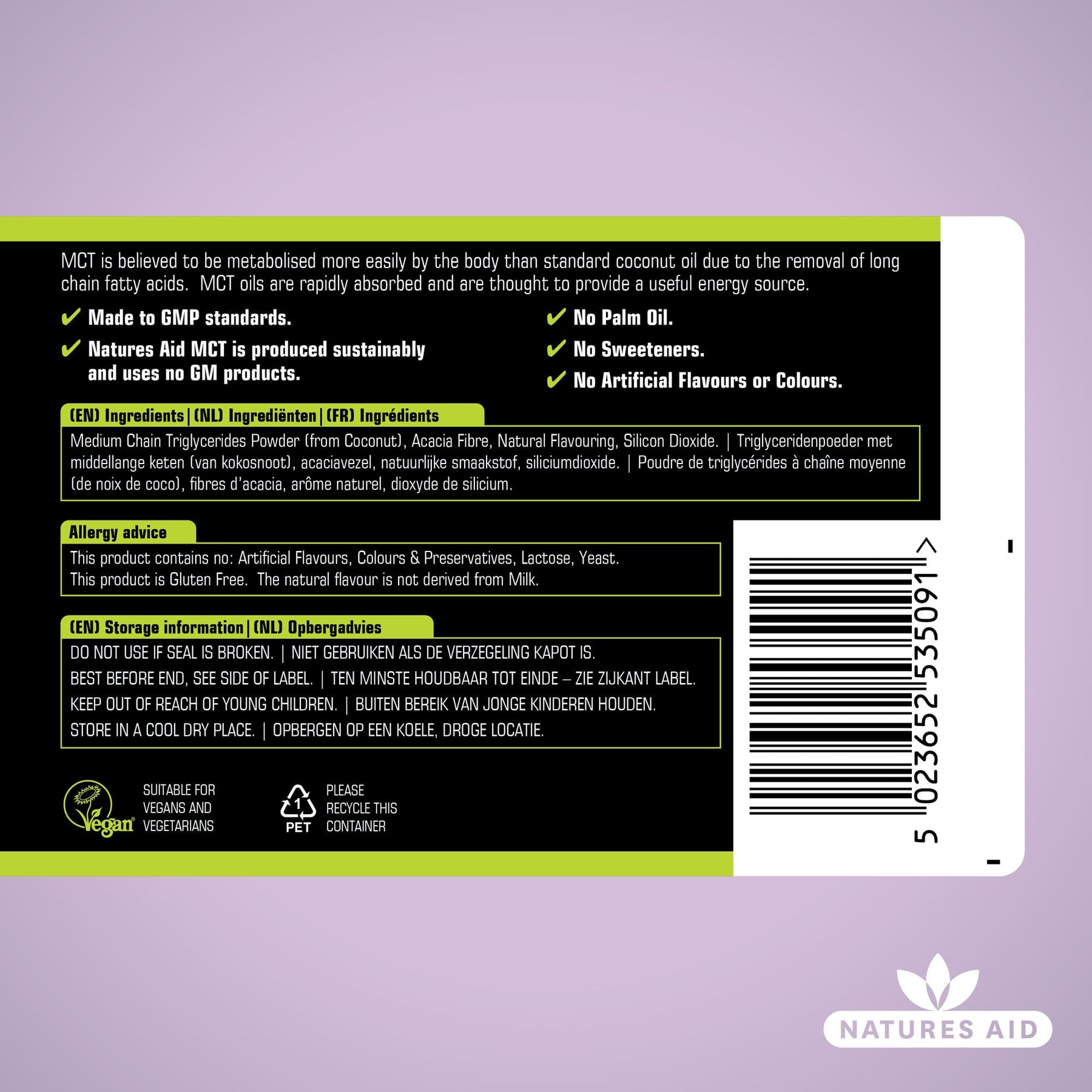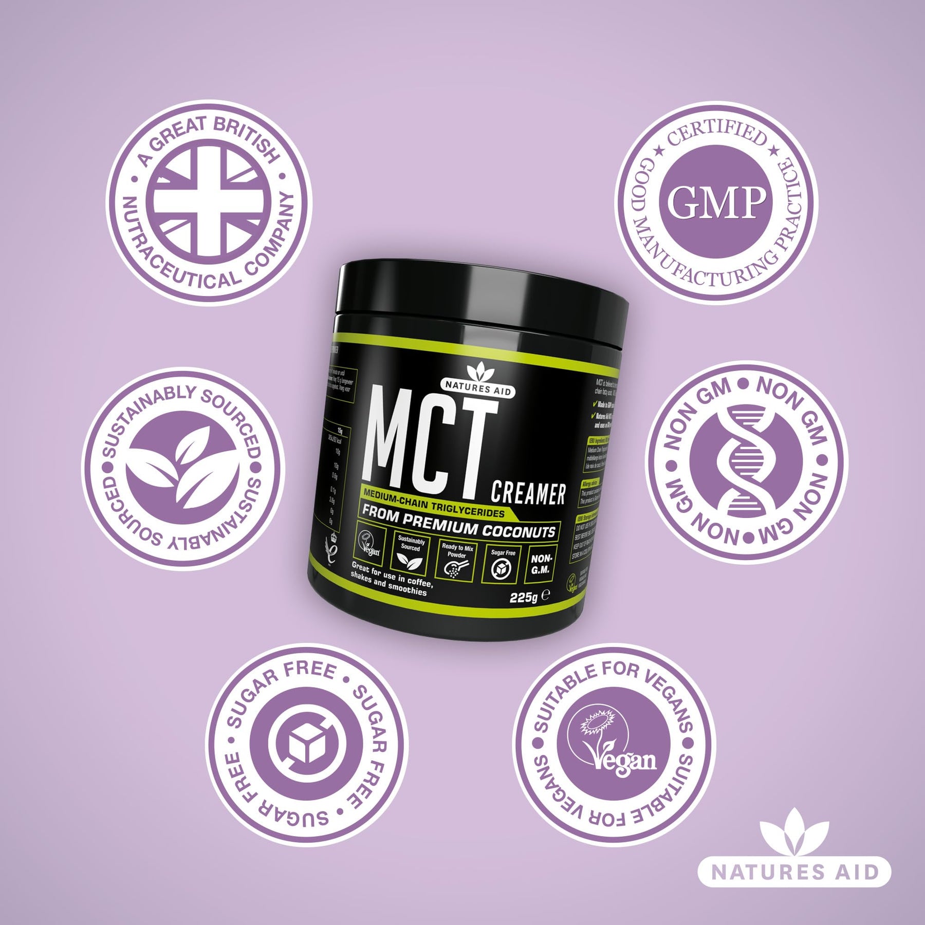 Produced sustainably with no GM products or palm oil, Natures Aid MCT Oil Creamer Powder is made in the UK to GMP standards. The formula includes MCT Powder (from Coconut Oil), Acacia Fibre, Natural Flavouring, and Silicon Dioxide for optimal mixability and digestive support.