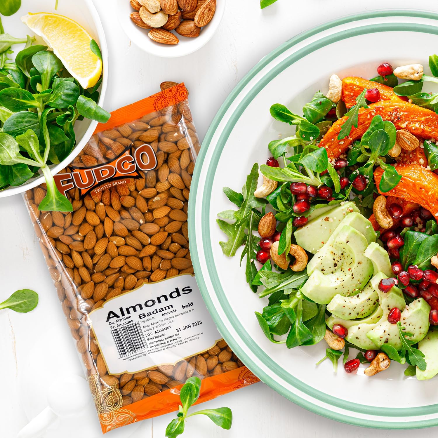 Enjoy the rich, nutty taste and satisfying crunch of Fudco Almonds Supreme, carefully sourced from the finest growers in California. These natural almonds are perfect for snacking on their own or enhancing your favorite recipes, from salads and baked goods to homemade granola and trail mixes. Packed with essential nutrients like protein, healthy fats, dietary fibre, antioxidants, and vitamin E, they're a nutritious addition to a balanced diet. Suitable for vegans and certified Kosher, these premium almonds offer both quality and versatility.