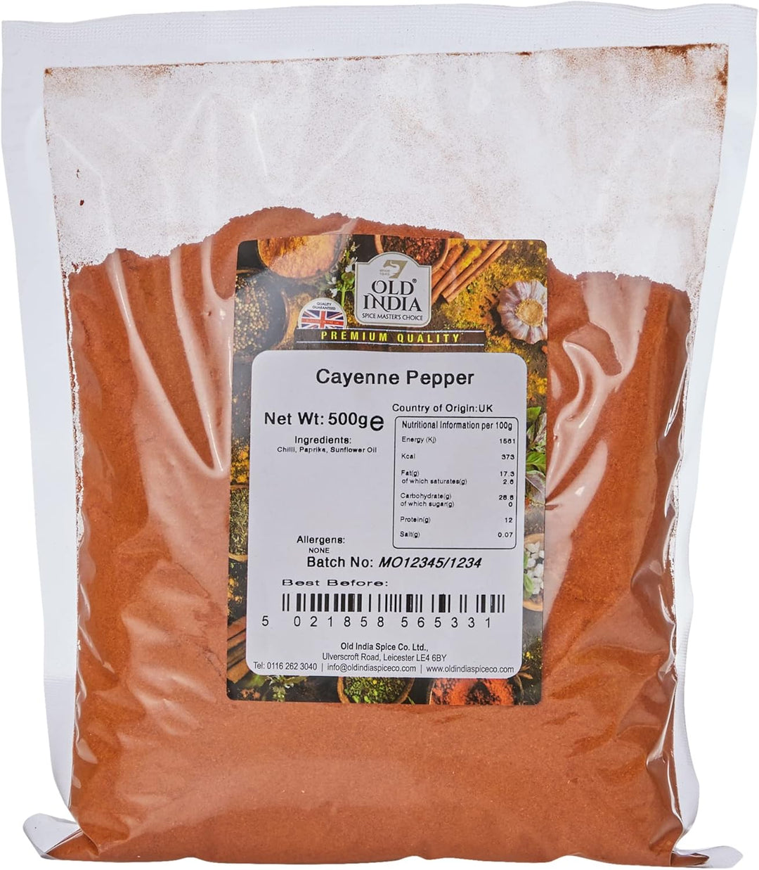 Old India Cayenne Pepper is a 100% natural, additive-free, and GMO-free spice, perfect for enhancing a wide range of dishes. Ideal for use in curries, vegetable dishes, sauces, soups, stews, and more, this cayenne pepper delivers bold flavor and heat. Sourced from the origin of the ingredient and packed in a vegetarian atmosphere, it ensures purity and quality. The heat-sealed 500g bag preserves freshness and provides a shelf life of up to two years, making it a reliable staple for your kitchen.