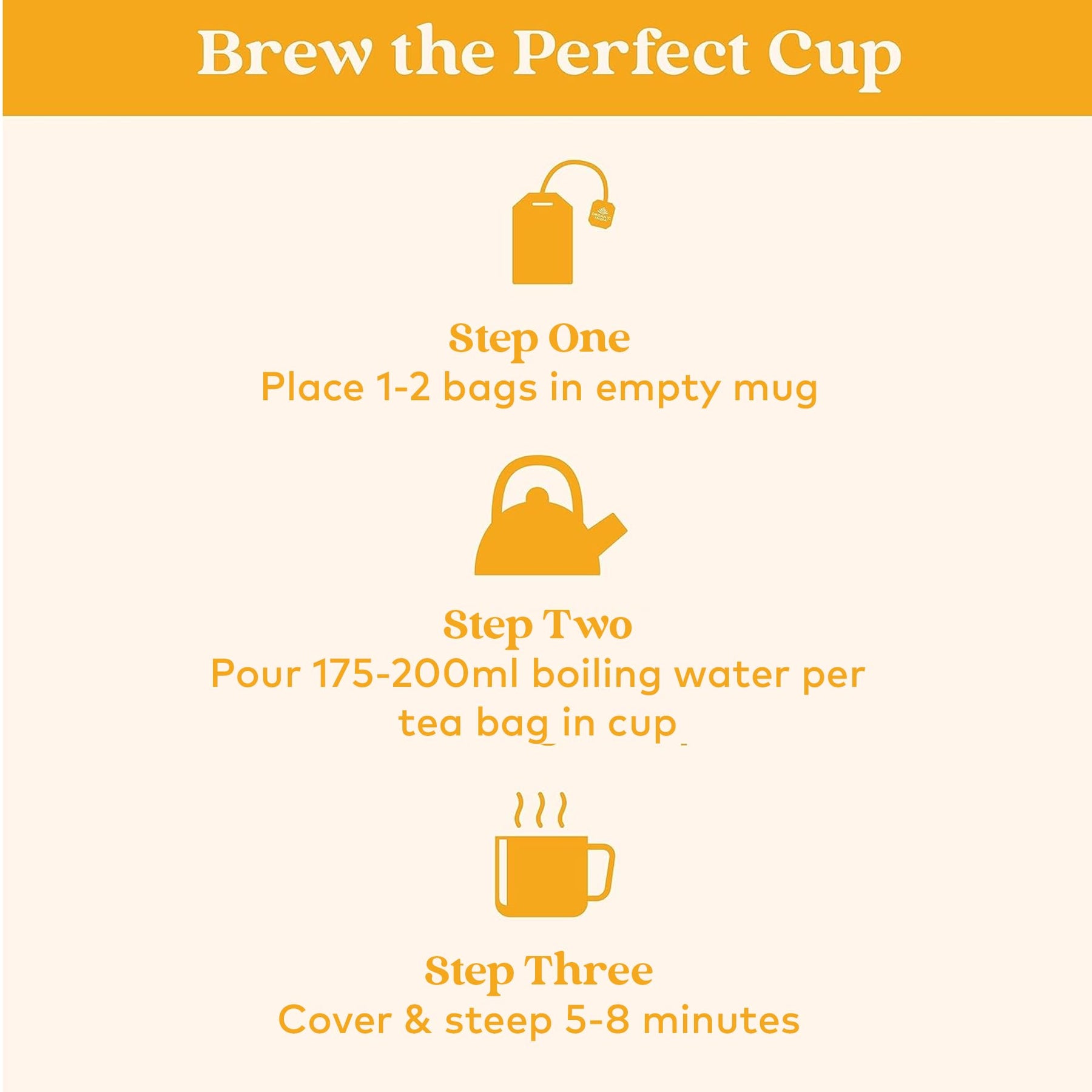• Brewing Instructions: Steep one tea bag in 8-10 ounces of hot water (200-212°F or 93-100°C) for 3-5 minutes. Enjoy hot or cold.