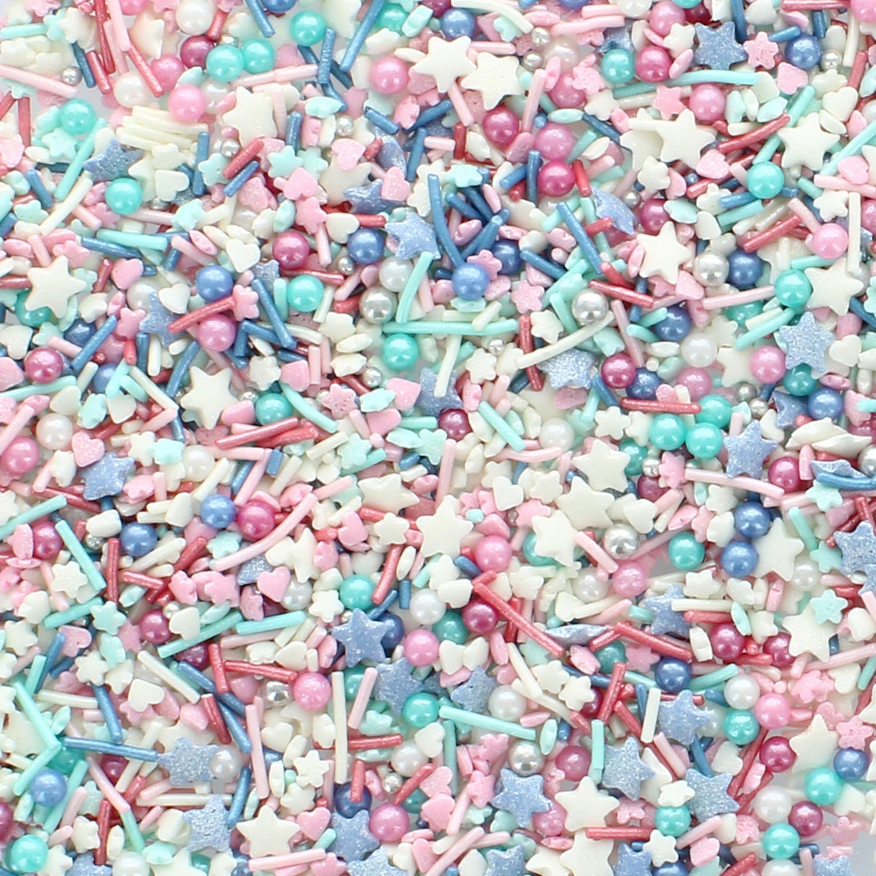• Mix of sugar strands, pearls, hearts, and stars in festive blue, pink, and white hues