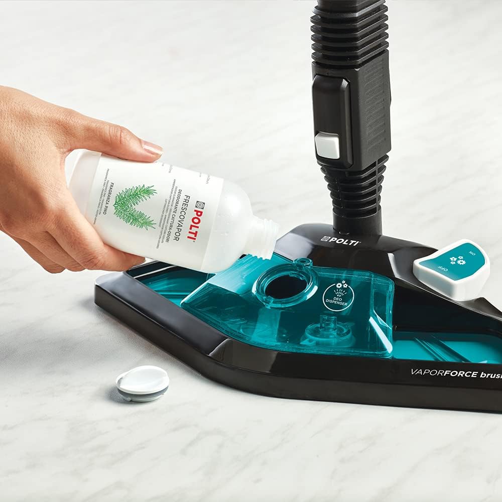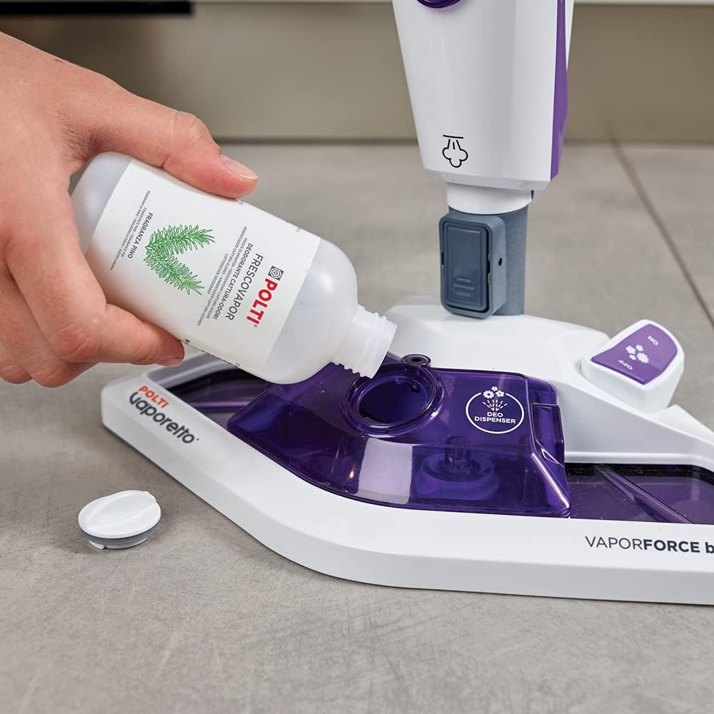 Polti FrescoVapor is a liquid air freshener designed to eliminate and capture unpleasant odours while releasing a refreshing natural pine scent during steam cleaning. Formulated with natural substances, it integrates seamlessly with compatible Polti Vaporetto models to deliver hygienic, scented cleaning throughout your home.