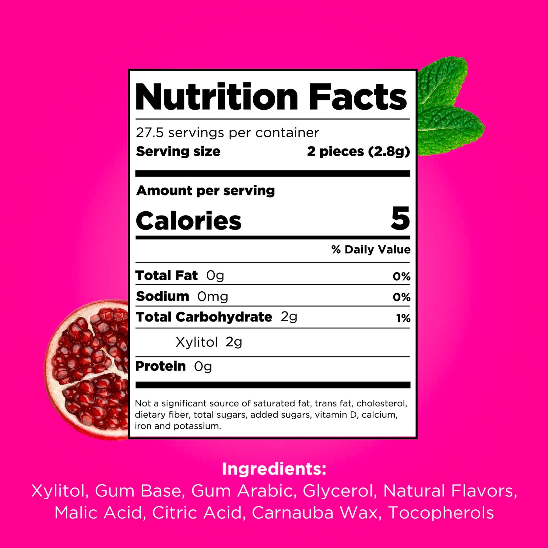 PUR Pomegranate Mint Sugar-Free Chewing Gum delivers a refreshing burst of tropical tanginess with every chew. Sweetened naturally with xylitol, this vegan gum offers a subtly sweet, fruity-fresh experience without sugar, aspartame, or artificial sweeteners. Perfect for maintaining fresh breath after meals, it comes in a convenient resealable bag to preserve flavor and freshness.