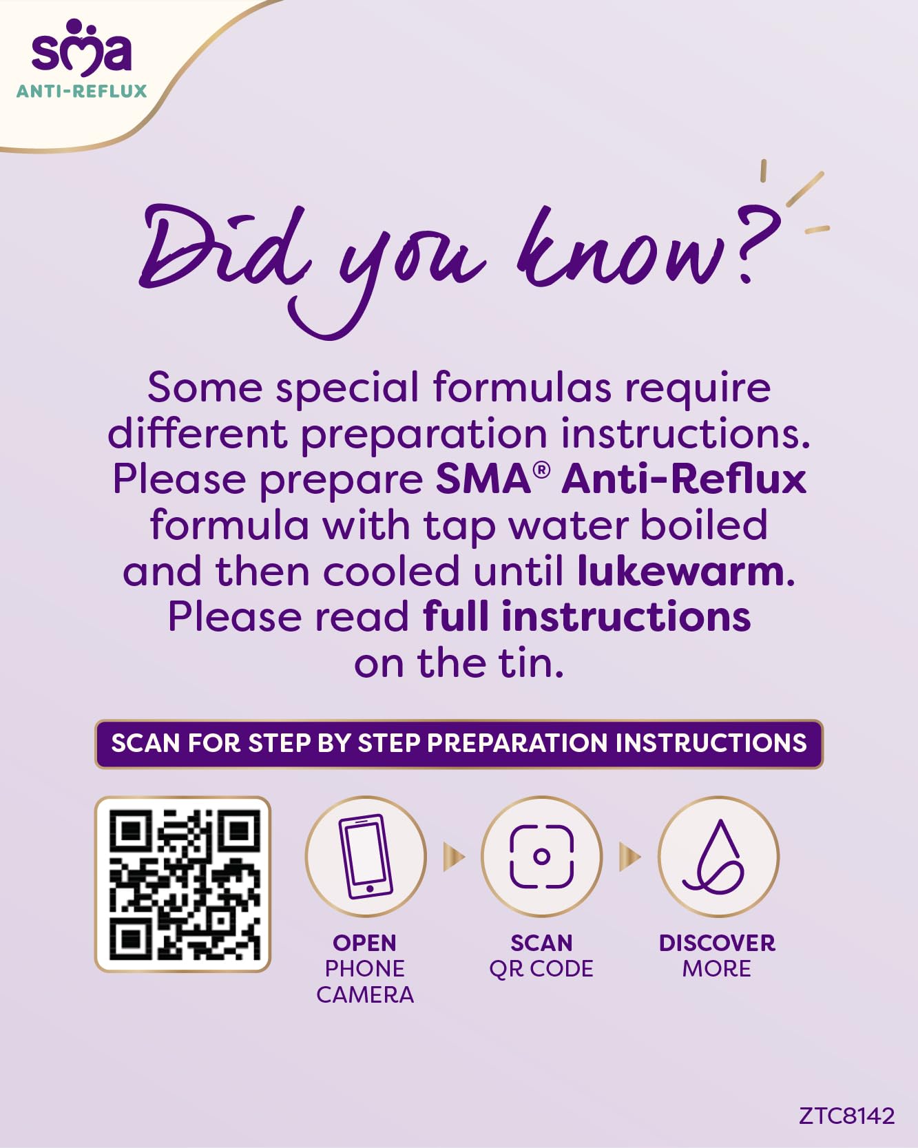 SMA Anti-Reflux Baby Milk Powder is a nutritionally complete formula designed for the dietary management of babies with frequent reflux (regurgitation or spitting up). It can be used as the sole source of nutrition from birth and is suitable for mixing with foods once weaning begins.