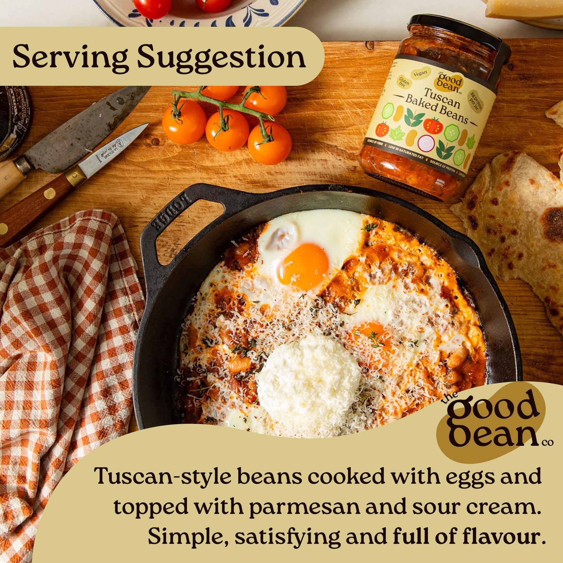 Experience a true taste of Italy with The Good Bean Co Tuscan Baked Beans – a wholesome, slow-cooked blend of premium cannellini beans, chopped tomatoes, red onion, courgette, kale, garlic, and aromatic herbs. This rich, flavourful dish brings the warmth of Tuscany to your kitchen with the convenience of tinned food, made in the UK using only honest, natural ingredients.