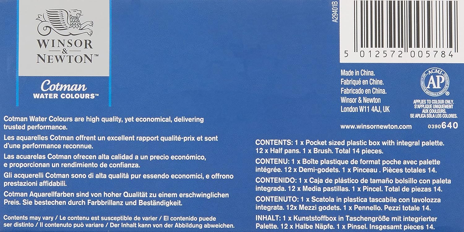 - Set contains: 1 travel brush and 12 Cotman half pans – Lemon Yellow Hue, Cadmium Yellow Hue, Cadmium Red Pale Hue, Alizarin Crimson Hue, Ultramarine, Cerulean Blue Hue, Viridian Hue, Sap Green, Yellow Ochre, Burnt Sienna, Burnt Umber, Chinese White