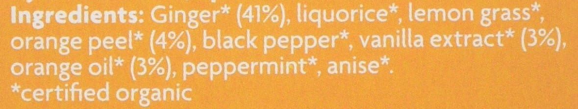 • Organic herbal tea blend with 41% ginger, 4% orange peel, 3% vanilla extract, and 3% orange oil