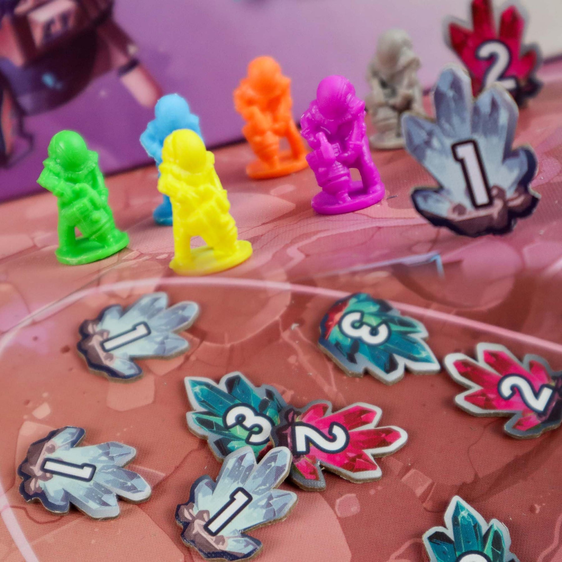 • Resources are revealed only when astronauts land, adding suspense and strategy.