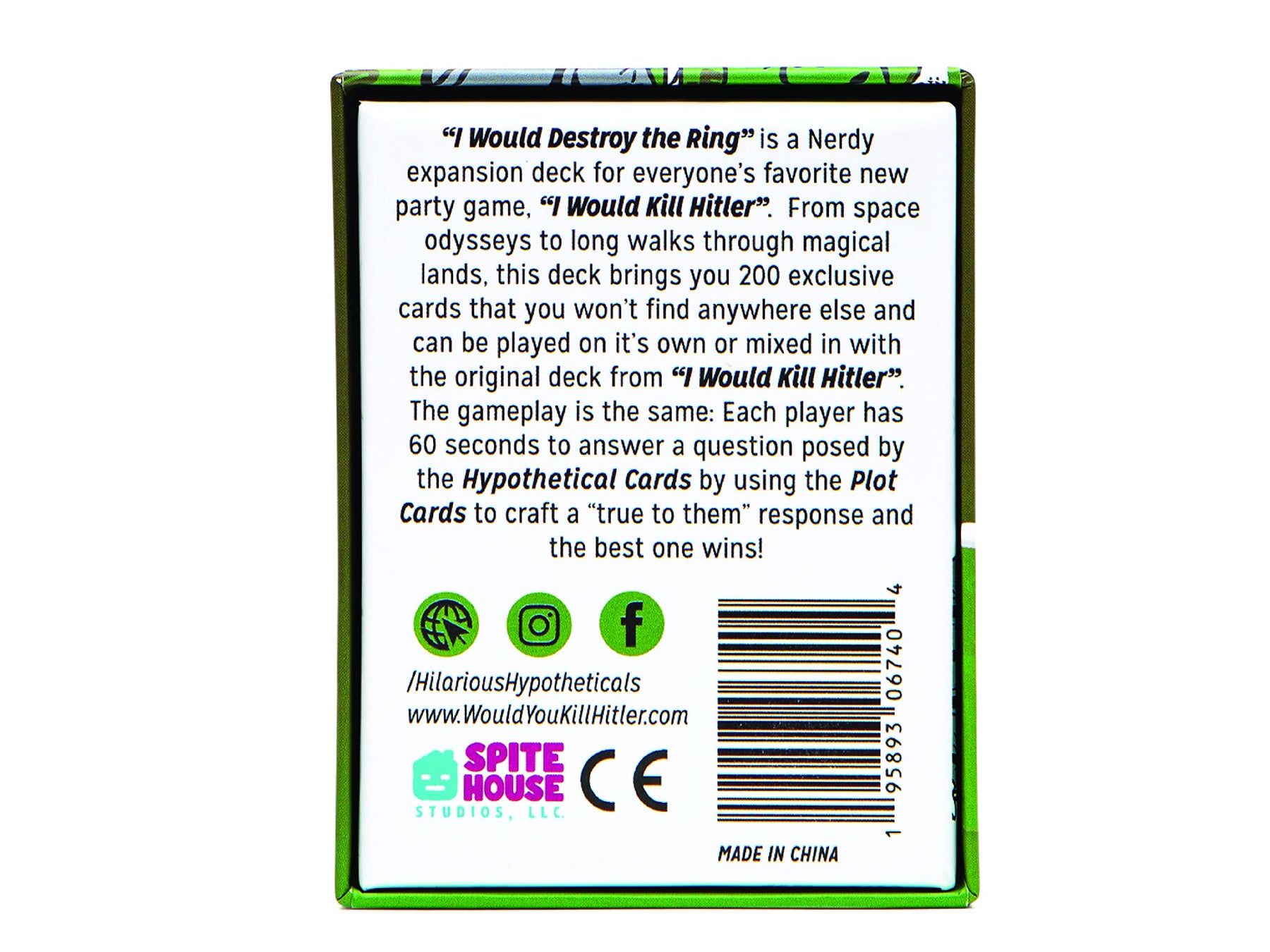 This standalone expansion pack for 'I Would Kill Hitler' dives into the wildest hypotheticals from sci-fi and fantasy nerd culture, featuring cards forged in the fiery depths of Mordor. In 'I Would Destroy the Ring,' players craft creative stories using plot cards to answer wild hypothetical scenarios, competing for the title of funniest, most realistic, or most random response.