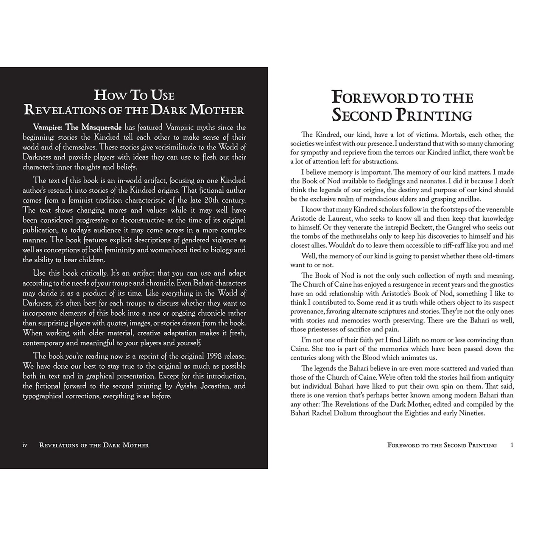 Delve into the dark and intricate world of Vampire: The Masquerade with this hardcover sourcebook, Revelations of the Dark Mother. Explore the ancient origins and hidden lore of the Kindred, uncovering secrets that shape the modern nights. This essential supplement expands the narrative depth and role-playing opportunities within the World of Darkness.