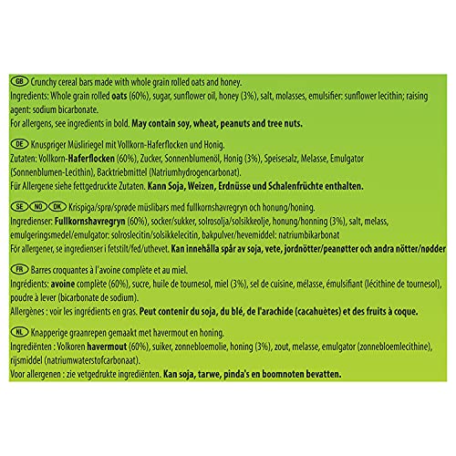 • Ingredients: Whole grain rolled OATS (60%), sugar, vegetable oils (sunflower, rapeseed), honey (3%), salt, molasses, emulsifier (lecithins), raising agent (sodium bicarbonate)