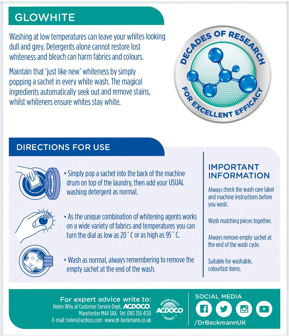 Dr. Beckmann Glowhite fabric whitener restores and maintains the brilliant whiteness of your clothes, effectively combating greying and yellowing that regular detergents can't handle. Ideal for use in every white wash, it works at temperatures as low as 20°C, helping preserve fabric integrity while delivering visibly brighter results.
