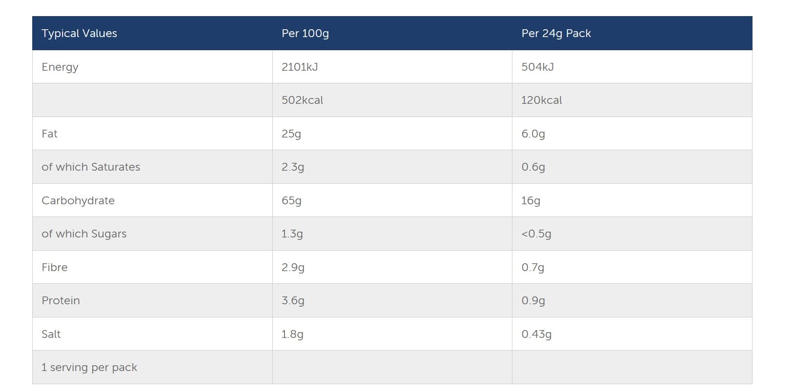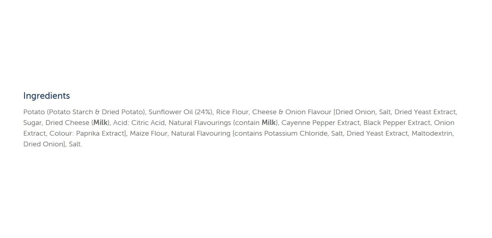 Potato (Potato Starch & Dried Potato), Sunflower Oil (24%), Rice Flour, Cheese & Onion Flavour [Dried Onion, Salt, Dried Yeast Extract, Sugar, Dried Cheese (Milk), Acid: Citric Acid, Natural Flavourings (contain Milk), Cayenne Pepper Extract, Black Pepper Extract, Onion Extract, Colour: Paprika Extract], Maize Flour, Natural Flavouring [contains Potassium Chloride, Salt, Dried Yeast Extract, Maltodextrin, Dried Onion], Salt.