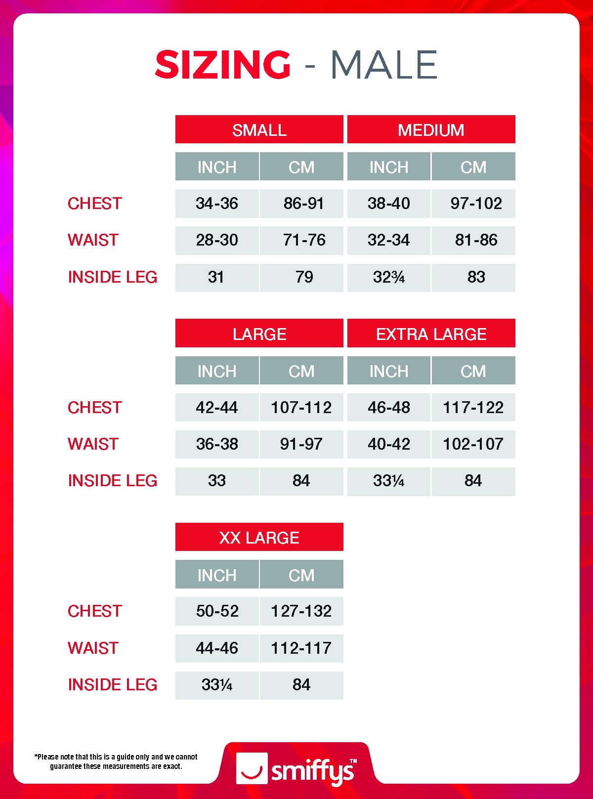 Brustumfang 106,7–111,8 cm, Taille 91,4–96,5 cm, Beininnennaht 83,8 cm.