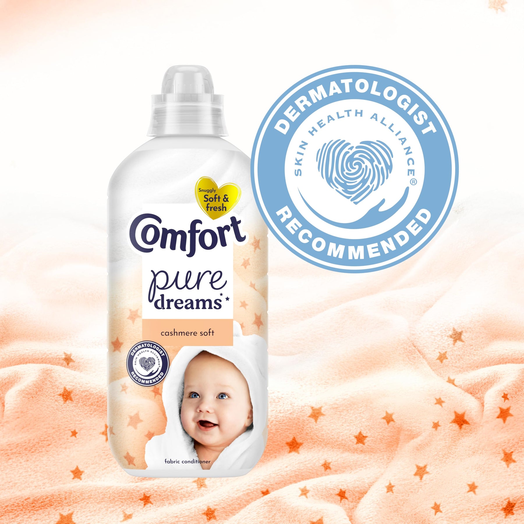 Infuse your laundry with luxurious softness and a delicate, soothing scent using Comfort Pure Dreams Cashmere Soft Fabric Conditioner. Dermatologist recommended by the Skin Health Alliance, this gentle formula is ideal for sensitive and baby skin, delivering snuggly soft clothes with every wash. Experience long-lasting freshness and enhanced comfort for all your washable fabrics.