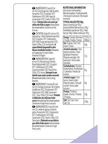 • Ingredients: sugar, glucose syrups, vegetable oil (palm), water, humectant (E422), emulsifier (E471), stabilizers (E415, E466), preservative (E202), colourings (E160a, E133), natural flavouring