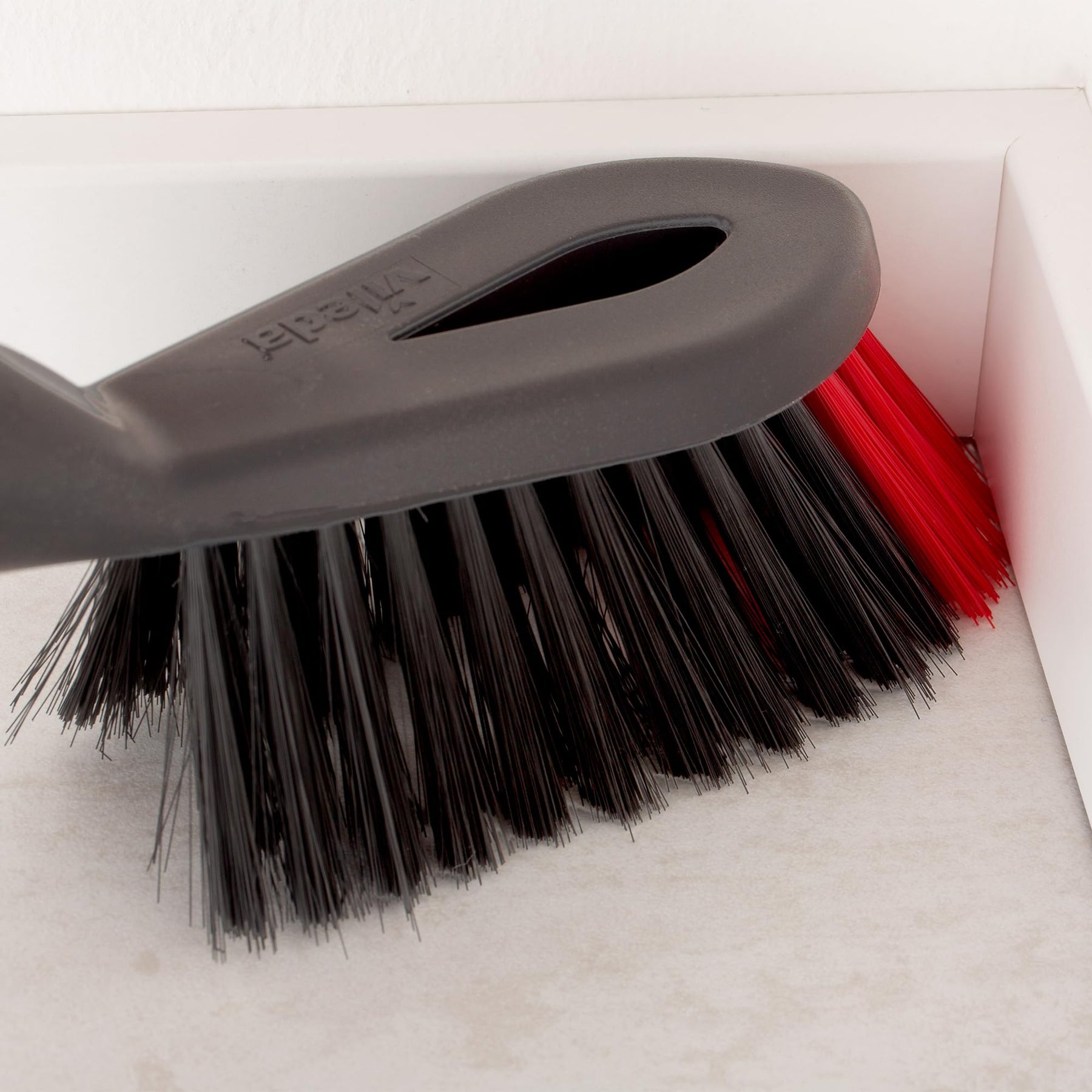 - 2-in-1 fibre sweeper with soft black fibres for dust and stiff red bristles for edges