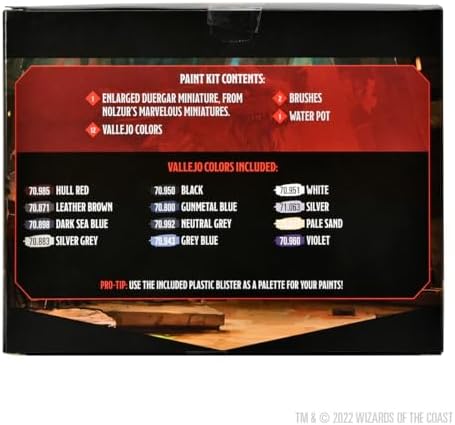 The set includes one unpainted Enlarged Duergar miniature, 12 high-quality Vallejo paint colors, two brushes, a water pot, and the innovative ability to use the blister pack as a paint palette. Everything you need for a complete painting experience is included.