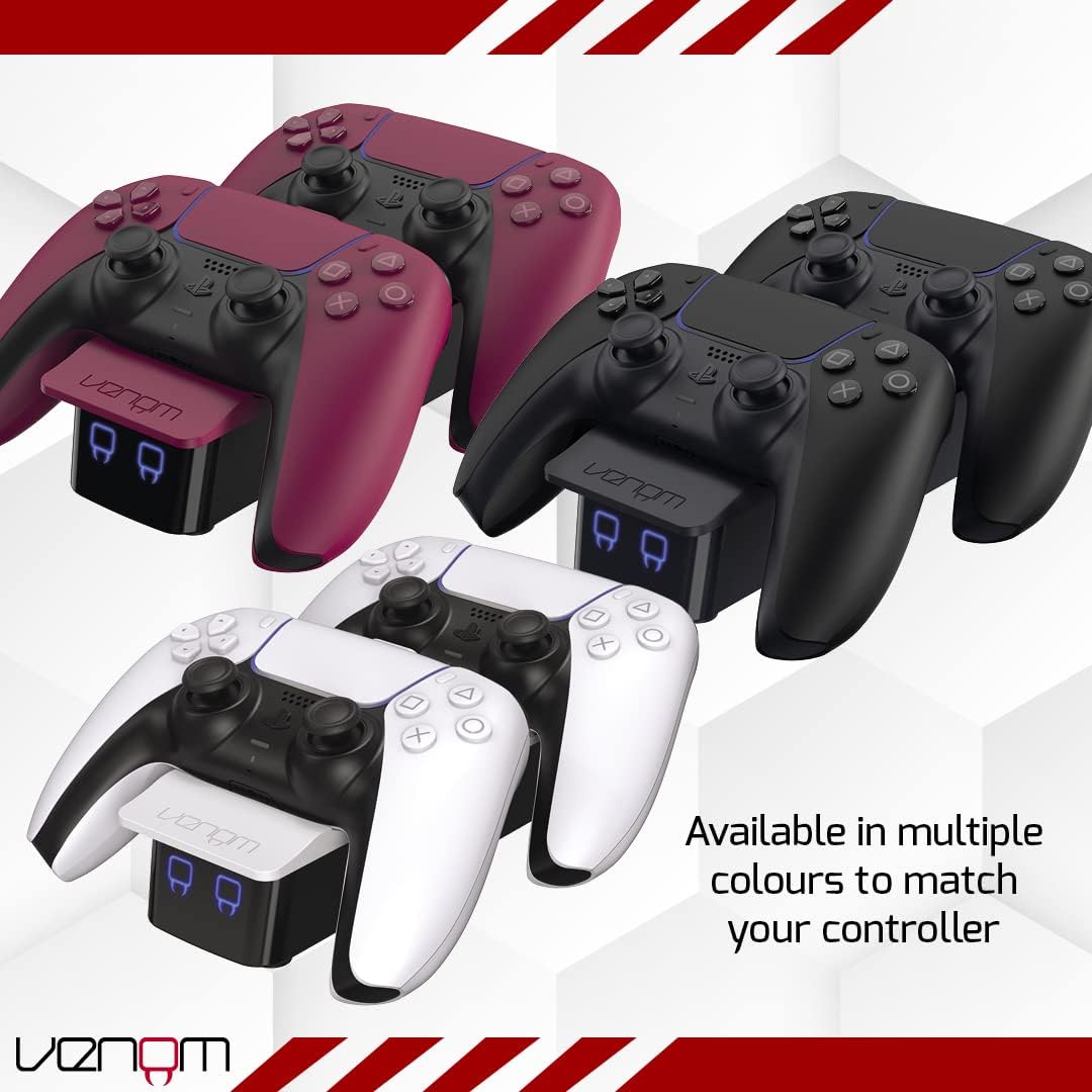 Keep your PlayStation 5 controllers powered and ready with the Venom Twin Charging Dock, designed to seamlessly match the sleek aesthetic of your PS5 console and DualSense controllers. This elegant 'drop and charge' station allows for fast, efficient charging of up to two controllers simultaneously—no messy USB cables required.