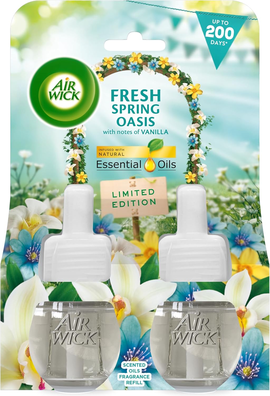 Refresh your home with the Air Wick Plug in Diffuser Twin Refill in Fresh Spring Oasis, designed to deliver long-lasting fragrance infused with Natural Essential Oils. Perfect for enhancing your living space, this refill set provides up to 100 days of continuous scent on the lowest setting, blending naturally with your home décor.