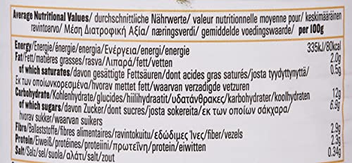 • Nutritional Information (per 100g): Energy 373kJ/89kcal, Fat 2.4g (saturates 0.5g), Carbohydrate 12.0g (sugars 4.9g), Fibre 3.8g, Protein 2.9g, Salt 0.43g